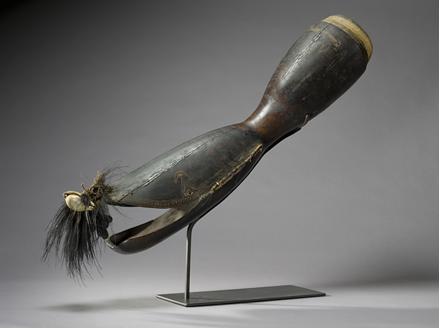 Top photo: Hand Drum (warup) circa 1850, made from wood, fiber, shell, and cassowary feathers. The hourglass-shaped drums of the Torres Strait Islands (Papua New Guinea) were created from a single hollowed-out piece of wood.