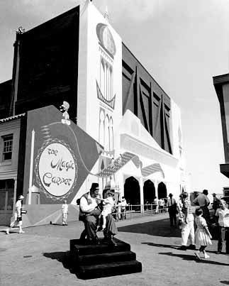 Steppenwolf’s enigmatic original bass player, Rushton Moreve, co-wrote Magic Carpet Ride. growing up in LA he was quite fond Pacific Ocean Park at Santa Monica beach and especially loved a ride called The Magic Carpet. his family said “One of his favorite places growing up was Pacific Ocean Park, the amusement part of Venice pier in Venice, CA. He was almost obsessed with his favorite ride, so, take for that what you will…” The Magic Carpet was a suspended flying car ride, much like the Peter Pan Flight at Disneyland. The flying carpets had canopies with a track attached above. it was a dark ride flying over the streets of ancient Baghdad through scenes from fairy tales including an immense giant from Jack and the Beanstalk, plus the treasure room from Ali Baba where the thieves peeked out from hiding places in large clay jars. (from “The Gear Page”)