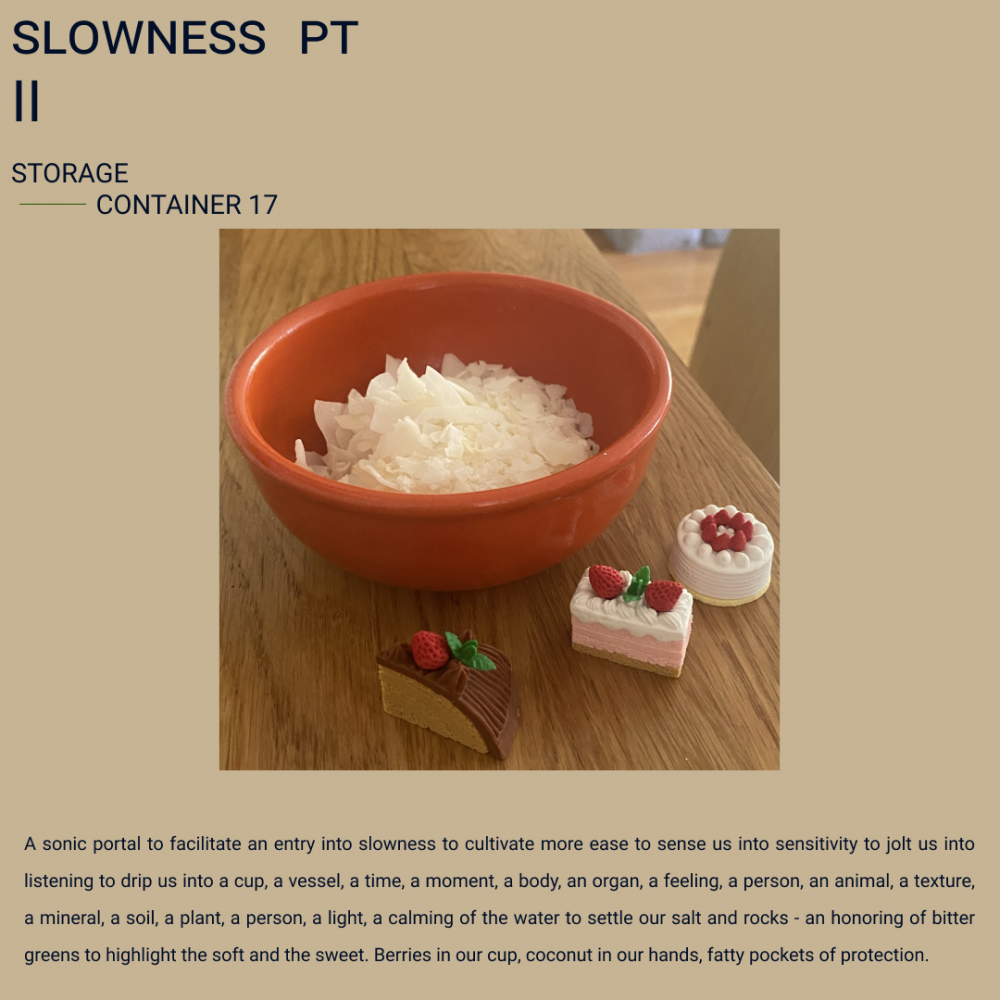 A sonic portal to facilitate an entry into slowness to cultivate more ease to sense us into sensitivity to jolt us into listening to drip us into a cup, a vessel, a time, a moment, a body, an organ, a feeling, a person, an animal, a texture, a mineral, a soil, a plant, a person, a light, a calming of the water to settle our salt and rocks – an honoring of bitter greens to highlight the soft and the sweet. Berries in our cup, coconut in our hands, fatty pockets of protection.