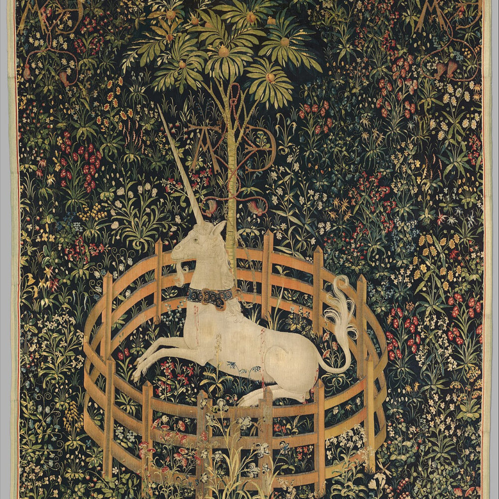 “The Unicorn Rests in a Garden” from The Unicorn Tapestries consisting of seven pieces first recorded in 1680, possibly designed in Paris and woven in Brussels.