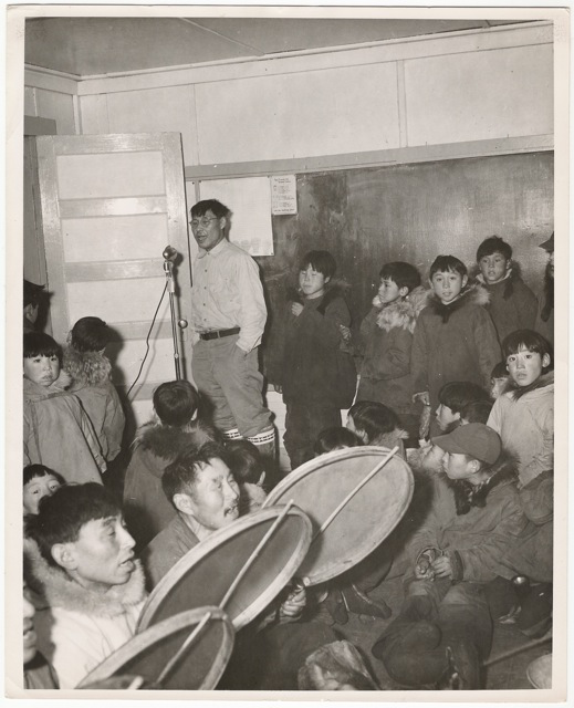Joseph Sikvayanuk standing at microphone. Whaling captain and dance group leader who shared the songs with Boulton