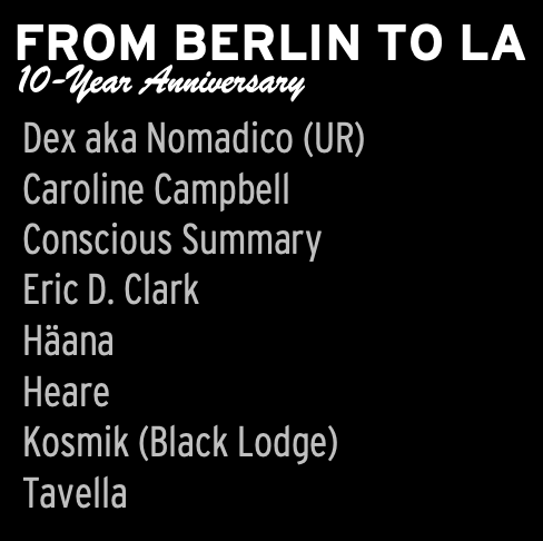 Your Mom’s celebrates a decade of LA and Berlin exchange together with cultural partners dublab, Consulate General of Germany Los Angeles, KCRW, Orchestral Tools, Seahorse Sound Studios, and The Black Lodge, and participating artists: Zernell Gillie for Grimy and NTS, Eric D. Clark and Tavella for the Berlin side of the improv’ recorded by 6zm, Häana, Harp Impressions (Caroline Campbell), and Heare for the LA side of the live improv’ in the first half of the show, DJs Kosmik and Dex (Underground Resistance) for the mix in the second part of the show, and Conscious Summary (Samur Khouja) for live visuals and sound at The Handbag Factory DTLA where the show was recorded.