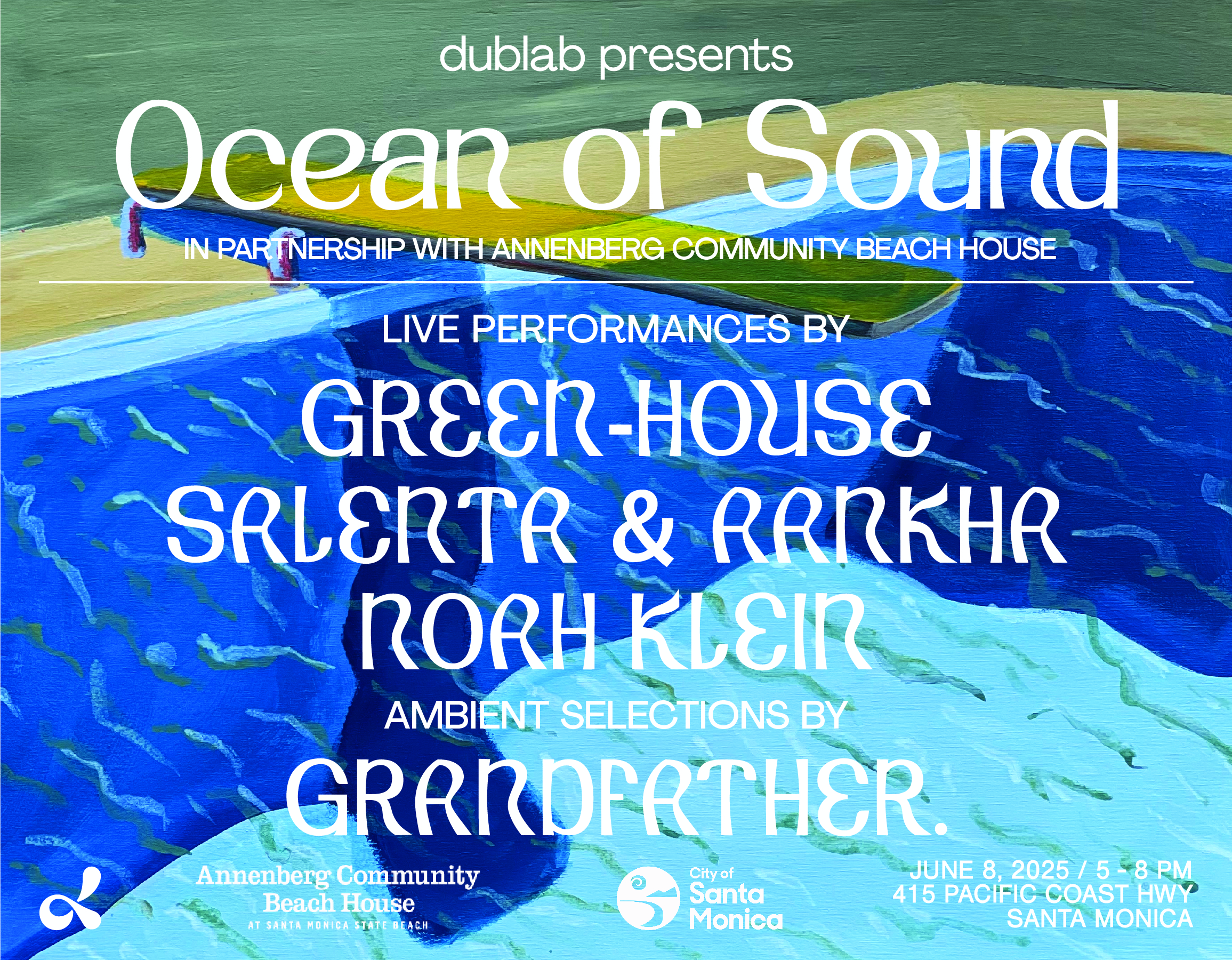 Back for its second consecutive year, dublab and the Annenberg Community Beach House present Ocean of Sound, an evening of restorative listening–above and below the water on June 8 from 5 – 8 pm. Lay back and lounge poolside, beneath the setting sun, or dive beneath the surface to experience our underwater speakers, resonating with meditative performances from Green-House, Salenta & Aankha, Noah Klein, and Grandfather.’s ambient selections.