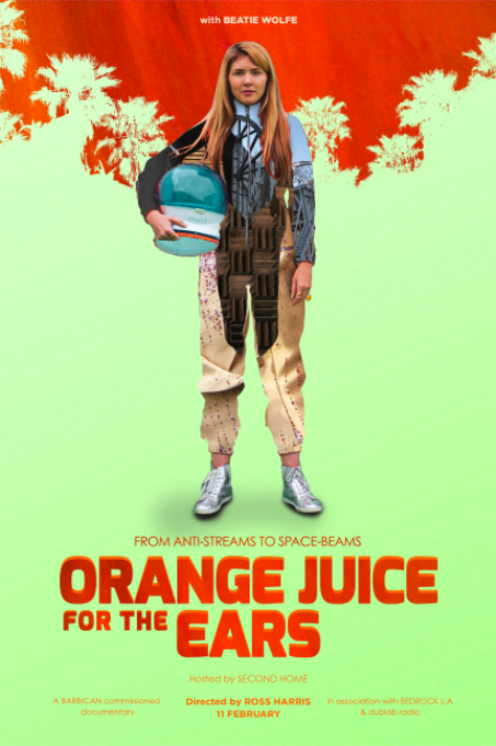 Second Home x dublab present Orange Juice for the Ears, the Barbican commissioned documentary on the work of musical weirdo and visionary Beatie Wolfe – an artist who has beamed her music into space, held an exhibition of her world first album designs at the V&A and been appointed a UN role model – as part of an experiential evening of film, art and conversation.