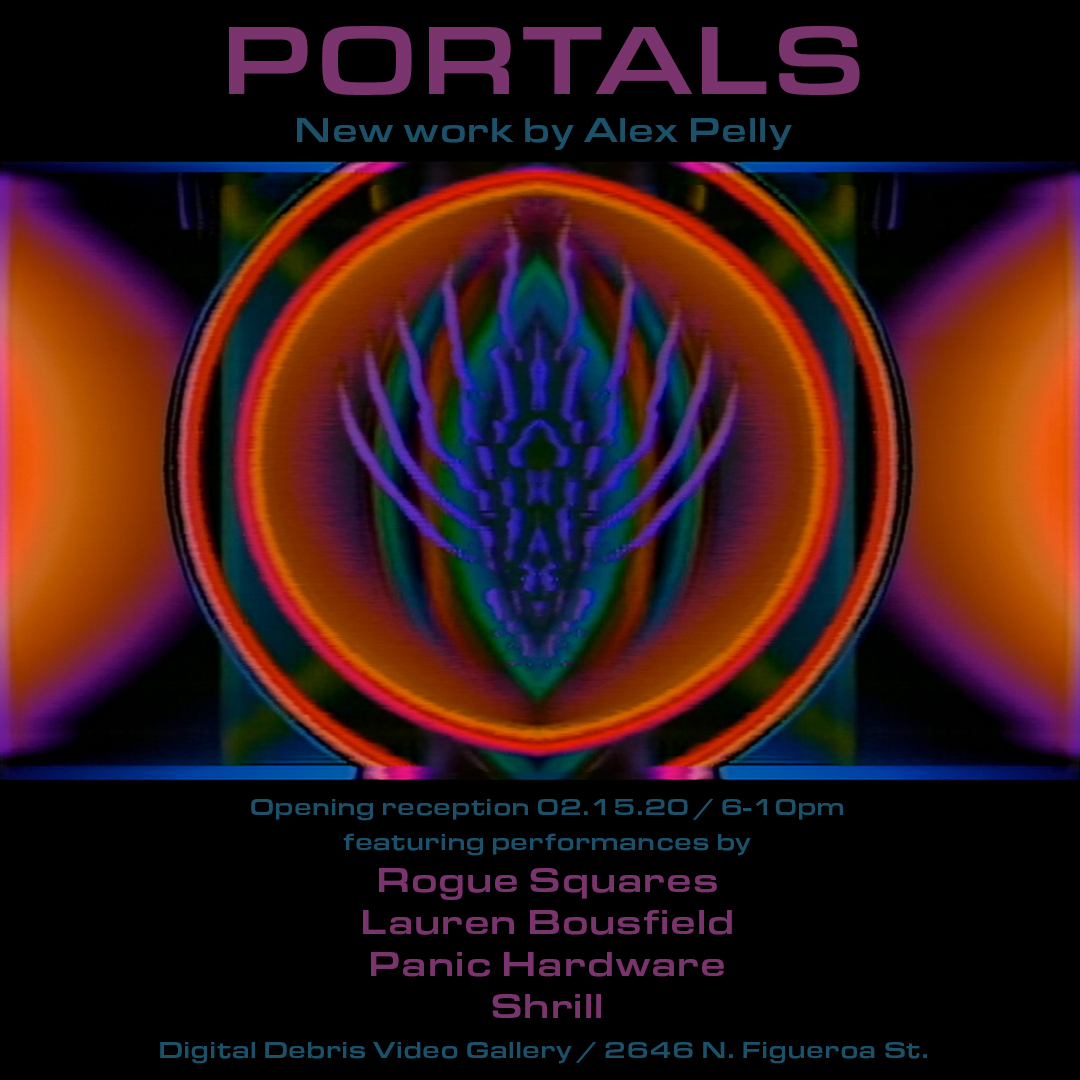 Portals is a site-specific video installation series created by Alex Pelly for Digital Debris. It explores experimental video as a doorway for the imagination. The exhibit is comprised of works which lead the viewer on a meditation of their own subconscious, offering a fixed point of focus and sense of forward motion through color, tempo, texture, and mood. The objective is to ignite a personal journey that is guided but untethered.