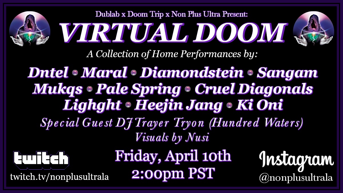 VIRTUAL DOOM Feat. Live at Home Performances by Dntel, Maral, Diamondstein, Sangam, Pale Spring, Mukqs, Cruel Diagonals, Lighght, Ki Oni, and Heejin Jang w/ DJ Trayert @hundredwaters