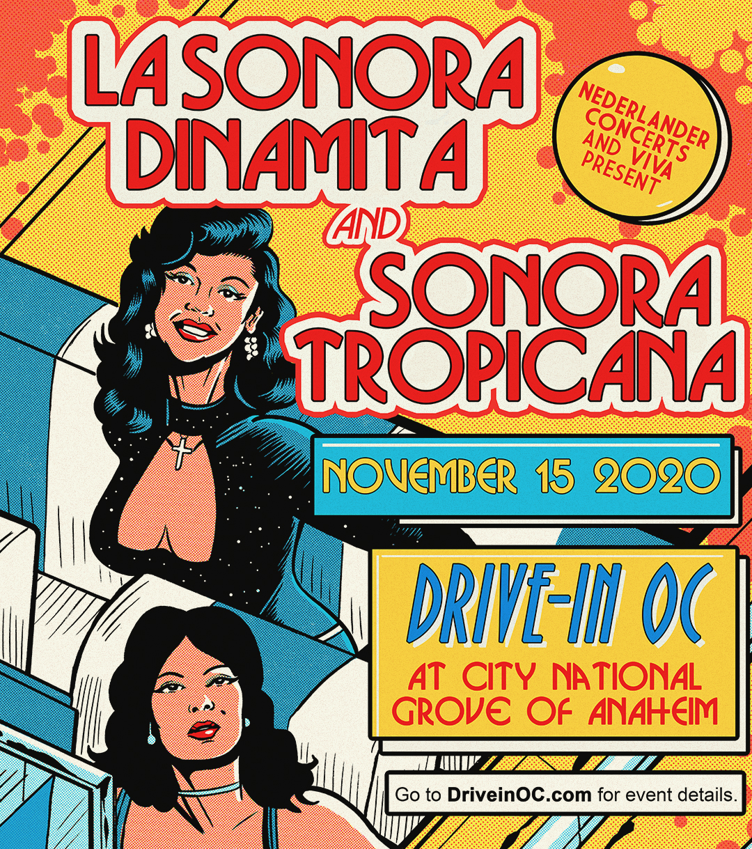 Colombian musical groups La Sonora Dinamita and Sonora Tropicana perform at the City National Grove of Anaheim’s Drive-In OC on November 15th. Tickets go on sale to the general public Friday, October 30th, at 10:00 AM via AXS.com. One ticket per vehicle, each passenger must have a safety belt (maximum of seven passengers per vehicle).