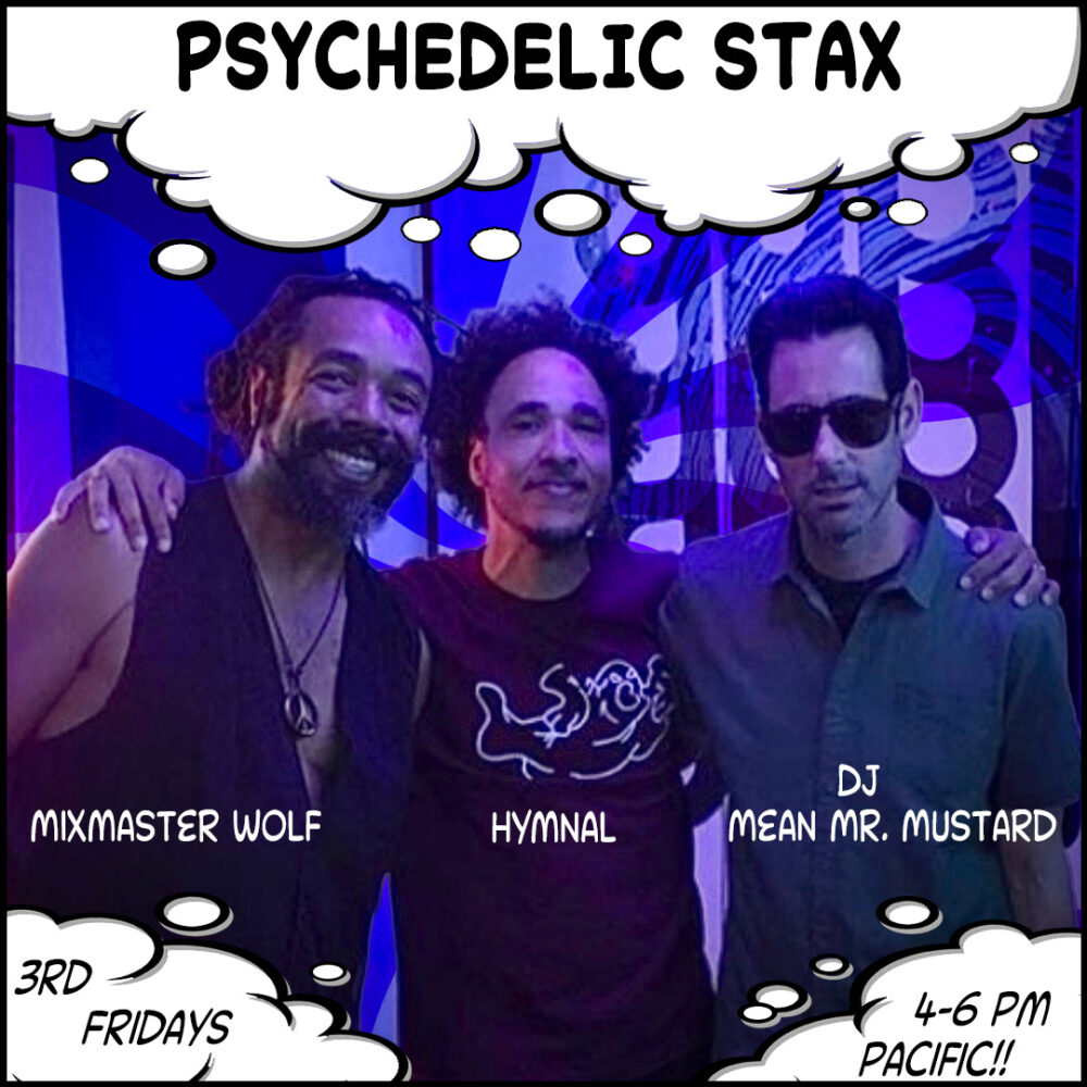 Your main source for Soul and Psychedelic music. Psychedelic Stax DJs Hymnal, Mixmaster Wolf, and DJ Mean Mr. Mustard blend the sounds of the 1960’s funk and rock to turn on and tune up your mind. From Curtom to Westbound, lend us your funky mind and we will play with it.